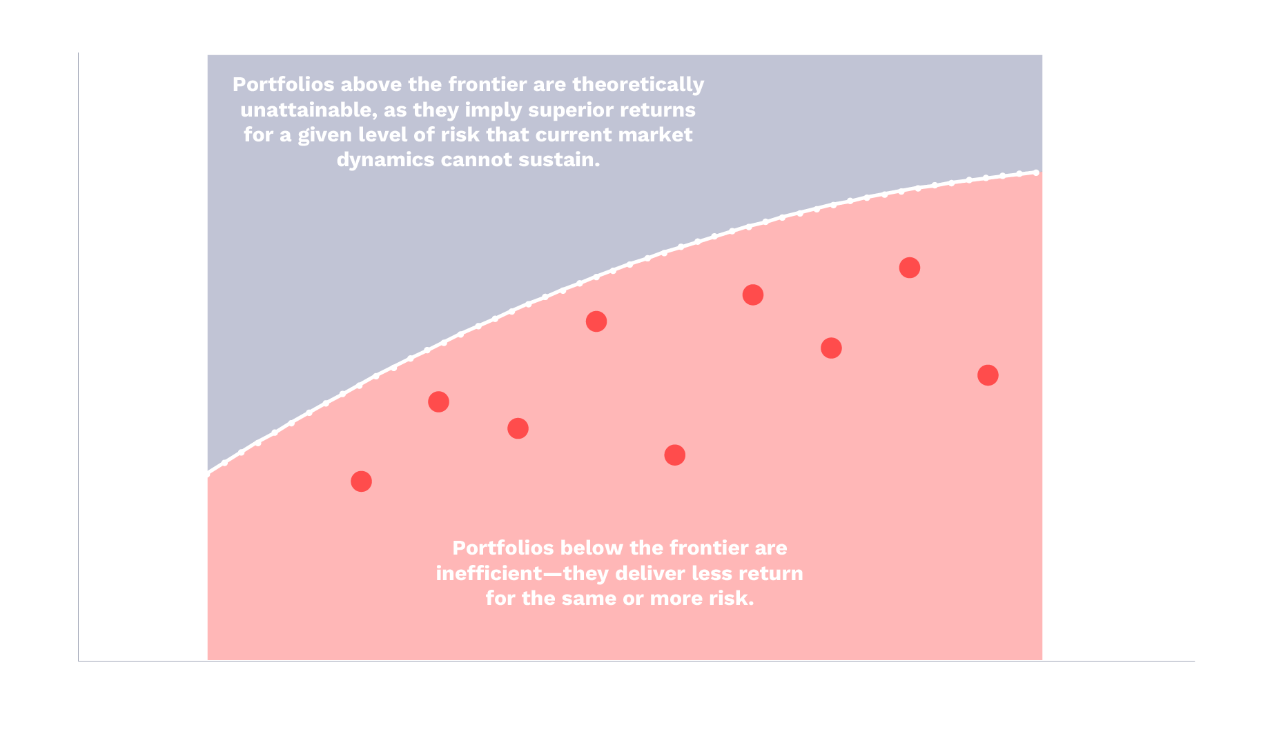 The efficient frontier illustrates the highest return an investor can expect for each level of risk. Portfolios below the frontier are inefficient, delivering less return for the same volatility, while portfolios on the frontier make optimal use of risk.
